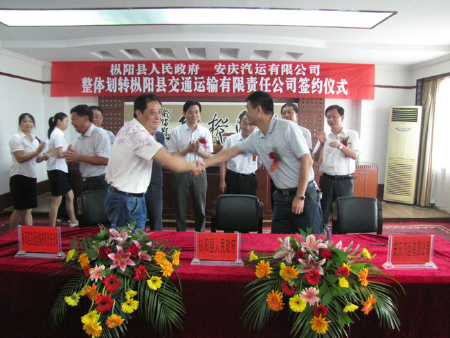 2011年9月1日,樅陽縣人民政府、安徽省交通集團(tuán)安慶汽運(yùn)有限公司整體劃轉(zhuǎn)樅陽縣交通運(yùn)輸有限責(zé)任公司簽約儀式在樅陽迎賓館會(huì)議大廳內(nèi)隆重舉行。樅陽縣縣長何謙、副縣長胡海峰,省交通集團(tuán)汽車運(yùn)輸有限公司副總經(jīng)理方詩喬,安慶汽運(yùn)有限公司董事長張進(jìn)、黨委書記徐軍、副總經(jīng)理王中明、彭宏、紀(jì)委書記郭峰,樅陽縣交通運(yùn)輸有限責(zé)任公司經(jīng)理童子健出席了簽約儀式。