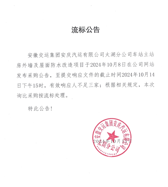 太湖分公司車站主站房外墻及屋面防水改造項(xiàng)目流標(biāo)公告
